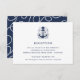 La tarjeta de detalle de recepción de estilo costero presenta los detalles de su recepción de boda en azul marino, acentuados con una ilustración de un ancla de barco dibujada a mano con sus iniciales en el interior. La parte trasera de las tarjetas tiene un patrón de cuerda náutica blanca sobre azul marino. Diseñada para coincidir con nuestra colección de invitaciones de boda 'Bien Anclado'.