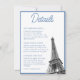 Comparte los detalles de tu evento con estilo con estas tarjetas de detalles de Bat Mitzvah con la Torre Eiffel en francés vintage. El diseño presenta un diseño floral de toile azul en la parte posterior con una foto de la Torre Eiffel y texto personalizado para compartir los detalles de tu evento en la parte delantera. Ingresa a la herramienta de diseño de Zazzle para hacer ajustes adicionales.