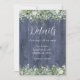 Tarjeta de detalles elegante con eucalipto de acuarela y flores blancas sobre fondo de madera navy. Perfecta para compartir información de la boda, direcciones o detalles de alojamiento. Parte de nuestro Conjunto de Boda de Madera de Navy Eucalipto.
