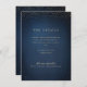 Brillo dorado falso sobre fondo azul marino oscuro, y monograma de pareja sofisticado en la parte posterior, Simple y elegante. Gran tarjeta de detalles de boda para boda clásica moderna y boda formal.