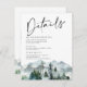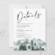 Tarjeta de detalles Boda de las Montañas Modernas. Tarjeta de detalles boda simple y moderna con un moderno encabezado caligráfico y un paisaje acuático montañoso o salvaje.