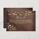 Añada información boda esencial con esta rústica tarjeta de detalles de madera con acogedoras luces de cuerda y delicado encaje floral dorado. Perfecto para compartir alojamiento, sitios web bodas, direcciones de recepción o detalles de RSVP. Elegante pero bohemio, complementa las bodas de otoño con un granero, país o estilo vintage.