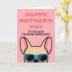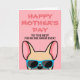 Frenchies, ¿qué mejor manera de mostrarle a tu Mamá cuánto la amas este Día de la Madre con una tarjeta personalizada solo de ti! El diseño presenta una ilustración estilo caricatura de un bulldog francés de color cervatillo claro que lleva gafas de sol azules con la leyenda "¡Feliz Día de la Madre a la mejor Mamá Frenchie de todas!" escrita en la parte frontal. El interior de la tarjeta dice "Para Mamá, te amo más que golosinas" pero se puede cambiar a la redacción de tu elección. También están disponibles versiones de bulldog francés de diferentes colores.