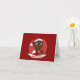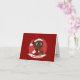 Tarjeta de felicitación con una ilustración de una niña o niño negro sonriente y feliz, el bebé lleva ropa roja y blanca y sostiene un regalo; con plantilla de texto editable para tu nombre o mensaje, diseño de vacaciones de Navidad con fondo rojo