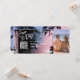 Tarjeta de embarque para boda en la playa de destino con código QR, avión dorado, guardar la fecha con corazón e icono de avión con mapa mundial de arte de línea minimalista simple y fondo de playa de palma