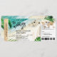Invitación de boda de destino de Isla Tropical Tarjeta de embarque de boda con RSVP, corazón e icono de avión con hojas tropicales