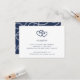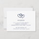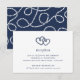 La tarjeta de encerramiento de recepción de boda de estilo costero romántico incluye los detalles de su recepción (hora, lugar y dirección) en azul marino clásico, coronada por un par de corazones de cuerda náutica anudados en azul marino.