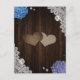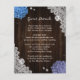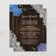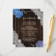 Proporcione a sus invitados con detalles importantes con esta tarjeta de encerramiento de boda floral morada y azul rústica con flores de hortensias azules y moradas sobre un fondo de madera de granero adornado con encaje floral blanco.