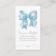 Este adorable hilo azul de la ducha de bebé tiene un suave color de agua azul en la parte superior. La tarjeta tiene un aspecto simple y mínimo clásico de la ducha de bebé, con texto gris en una mezcla de fuente serif y tipografía de guion. Animar a los invitados a traer un paquete de pañales para que la madre entre en un dibujo de rifas. En la parte inferior hay un espacio para que el cliente escriba su nombre. Perfecto para celebrar a un bebé, este diseño atemporal también funciona como una opción neutral de género para una madre que ama el azul. La parte posterior presenta un fondo azul claro y puede personalizar los colores de fuente y el color de fondo para que coincidan con el tema. Trabaja maravillosamente en cualquier época del año. Simple Bonito acuarela Azul Bow Baby Shower Tema Diaper Raffle Ticket Card Juego Fiesta.