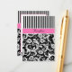Esta moderna y moda tarjeta de recepción con damasco floral a rayas blancas, negras y rosas combina con la invitación a la boda que se muestra a continuación. También puede utilizarla como tarjeta de mapa o de direcciones o tarjeta de información del boda cambiando el texto en consecuencia. ****POR FAVOR, NOTE que todo se imprimirá tal como lo ves en tu monitor. No veré tu producto y Zazzle NO editará nada para tipografía, alineación, etc., así que asegúrate de que todo tu texto esté centrado y libre de errores. Si necesitas ayuda, por favor envíame un correo electrónico ANTES de realizar tu pedido. Si necesita algún elemento coincidente, envíe su solicitud a niteowlstudio@gmail.com.