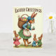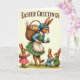 Este diseño muestra un gran conejo antropomórfico con un pañuelo y blusa azules y un delantal verde, de pie con calma mientras sostiene una cesta tejida llena de huevos decorados 🐰. Con mejillas sonrosadas y una mirada suave y cariñosa, se inclina hacia adelante como si ofreciera un solo huevo azul a un amigo que está justo fuera de la imagen. A la izquierda, un conejo más pequeño con un vestido rosa acuna una pequeña cesta y un huevo amarillo, observando con atención ansiosa y afectuosa. En primer plano, dos conejitos se enfrentan muy cerca, con las patas tocándose mientras se pasan un huevo rosa en un dulce momento de compartir 🐇. Los suaves tonos pastel marrones, verdes y azules dan forma al pelaje y la ropa, mientras que los huevos añaden toques más brillantes de color en toda la escena. Cerca de la parte superior, aparece un breve saludo en tinta oscura, centrado encima de los personajes con letras