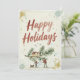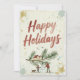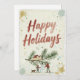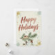 Celebre la temporada con esta tarjeta de Felices Fiestas hecha con acuarela, que presenta una acogedora cabaña, un muñeco de nieve juguetón y vegetación invernal rústica. El suave efecto de acuarela añade un toque encantador y pintado a mano, perfecto para enviar cálidos deseos a familiares y amigos.