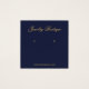 Una simple tarjeta de exhibición de aretes azul marino y dorado: solo texto dorado sobre fondo azul marino. El nombre está escrito en una caligrafía elegante debajo, los lugares de los aretes indicados por dos círculos muy pequeños. La página web está escrita cerca del borde inferior.