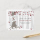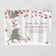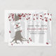 Una tarjeta de fecha de guardar de boda de invierno con una ilustración de un árbol en un bosque nevado. El árbol tiene hojas rojas, blancas y plateadas, raíces expuestas y un tronco envuelto con una pancarta que se puede personalizar con los nombres de la novia y el novio.