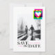 Una tarjeta de fecha de guarda con diseño de moda con una foto y un toque brillante de color en estilo de impresión CMYK.