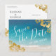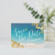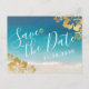 Playa de arena con olas oceánicas y bonitas flores de hibisco de oro en la que se ahorran las postales de fecha diseñadas para una boda de boda hawaiano o de playa tropical. Edite nuestra elegante plantilla para personalizarla con fuentes y colores personalizados, o incluso cambie todo el diseño y mantenga sólo lo que le gusta que coincida con el tema de la boda de destino!