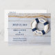 Esta moderna tarjeta de "save the date" es perfecta para una boda con un tema náutico. Cuenta con un salvavidas de barco sobre un fondo con textura de madera. Una cuerda y una red de pesca añaden al ambiente marino. Utilice esta tarjeta de "save the date" para una boda de playa, una boda junto al mar o una boda de destino. Esta tarjeta es fácil de personalizar con la información de la boda. Agregue la dirección de devolución y un mensaje especial en el reverso. Esta postal mide 5,6” x 4,25” (horizontal) y está impresa en papel de 120 libras ultra pesado con acabado brillante.