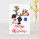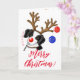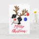 Cute Border Collie está vestido con su nariz roja Rudolph de vacaciones y cánticos de renos, completa con decoraciones colgantes de árboles de Paz y Alegría. Personalizar esta tarjeta con el nombre de sus perros, su saludo de vacaciones preferido y el sentimiento interno. También están disponibles los diseños Black, Yellow y Fox Red Labrador Retriever.