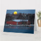 Tarjeta de felicitación doblada de antigua casa de barcos de madera roja con luna llena en el fondo y Mar Báltico helado en primer plano en Lauttarsaari, Helsinki.