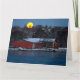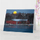 Tarjeta de felicitación doblada de antiguo cobertizo para barcas de madera rojo con luna llena en el fondo y Mar Báltico helado en primer plano en Lauttarsaari, Helsinki