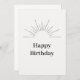 Una tarjeta de felicitación de cumpleaños con sol con un fondo. El diseño presenta una gran ilustración de un sol alegre en el centro, con una cara sonriente y rayos radiantes. Alrededor del sol, hay acentos juguetones como pequeñas nubes, confeti o pequeñas estrellas en tonos blancos y pastel. El texto "¡Feliz cumpleaños, sol!" está escrito en letras artísticas y negritas,