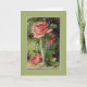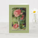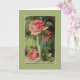 Un saludo de cumpleaños con elegantes rosas rosas rosas en pleno florecimiento; dos en un jarrón y otra rosa rosa en la mesa al lado del jarrón. Mensaje: Saludos de cumpleaños. Imagen de una postal de época sobre un fondo verde-amarillo personalizado.