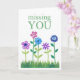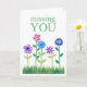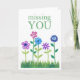 Una tarjeta de bonito "Missing You" (Te falta) con una hilera de flores rosas, azules y violetas empujando hacia arriba a través del pasto, de un collage de papel pintado a mano de Judy Adamson. Por favor, contáctame a través de mi tienda si quieres que cambien el texto de la portada y el interior quede en blanco para tu propio mensaje.