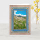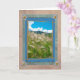 Tarjeta de felicitación fotográfica con aspecto de libro de caracoles con hierbas onduladas en un prado con montañas y un cielo azul vibrante en segundo plano. Esta tarjeta puede ser personalizada con su propio texto haciendo clic en el botón "Personalizar" o dejándola en blanco. Fotografía original.