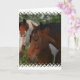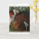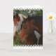 Pintura y caballo de bahía que abraza encima de tarjeta de felicitación.