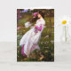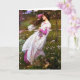 Tarjeta de felicitación de los Windflowers de John William Waterhouse. Pintura al óleo en lona a partir de 1902. El Pre-Raphaelite John William Waterhouse pintó con frecuencia temas literarios, y los Windflowers son un ejemplo hermoso de la fascinación de por vida del artista con las heroínas poéticas. La pintura ofrece a una mujer joven con el pelo negro oscuro que se coloca en un campo de flores salvajes como los azotes del viento a través de la escena. Ella lleva un vestido blanco con las mangas, la falda y la costura púrpuras. En su delantal ella lleva las flores del rosa, púrpuras y rojas que ella sostiene cerca contra el viento. Un gran regalo para las fans de J.W. Waterhouse, los Pre-Raphaelites, y pintura romántica inglesa.