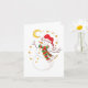 Tarjeta de felicitación con los colores clásicos de la Navidad: rojos, verdes y dorados hacen que esta ilustración brille con alegría navideña. Un alegre muñeco de nieve adornado con una bufanda acogedora y el sombrero de Santa mira hacia la luna y las estrellas de la Nochebuena, esperando la magia que traerá la mañana.