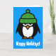 Tarjeta de saludo de Navidad de dibujos animados de pingüino divertido. Ilustración de pingüino lindo con sombrero de invierno verde. Saludo de Felices Fiestas no denominacional.