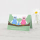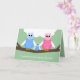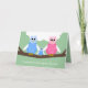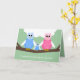 Esta adorable tarjeta de felicitación para niños de recién nacido incluye a una linda familia de búhos sentados en una rama de árbol con búho mami y Daddy poniendo los brazos alrededor de búho. Usted puede personalizar el diseño con los nombres de los nuevos padres. Dentro de la tarjeta hay un hermoso verso de felicitaciones. Derechos de autor Kathy Henis