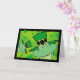 Tarjeta de saludo del Día de San Patricio con ranas graciosas usando gorras de leprechaun con hebillas de oro. El fondo está lloviendo rocas de champú sobre un fondo verde de quemaduras de sol.