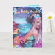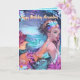 Tarjeta de cumpleaños de sirena de acuarela en el mar. Este diseño de acuarela tiene mucho azul y rosa. El fondo tiene olas del océano y un cielo colorido. La sirena lleva el pelo recogido con una diadema de flores. ¡Sumérgete en el encantamiento! Perfecto para los amantes de las sirenas. Alegrar el día de alguien con esta impresionante tarjeta.