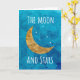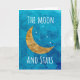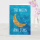 ¡Para la estrella, soñadora y niña de corazón! Este diseño de estrellas y luna con fondo azul es ideal para muchas ocasiones. El interior está en blanco para tu propio mensaje especial.