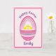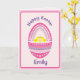 Tarjeta feliz de Pascua con huevo de Pascua con tres pollitos. Personalízala como desees. El verso interior dice 'Deseándote una Pascua e-xcelente'