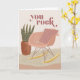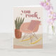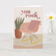 Esta tarjeta de saludo cuenta con una escena de boho en la sala de estar protagonizada por un mecedor moderno de mediados de siglo, en tonos rubor, una alfombra de piel de oveja y una planta de serpientes. Un tipo de inspiración retro dice "tú rocas". En su interior está en blanco, por lo que es versátil para muchas ocasiones y destinatarios.