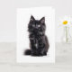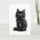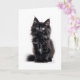 Gatito negro dulce de pelo largo con un toque de pelo blanco en el pecho.