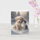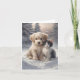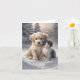 Tarjeta de felicitación en blanco con un cachorro adorable y un gatito posando en la nieve.