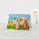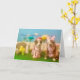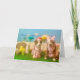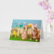 Tarjeta de Pascua humorística. 2 perros con vestidos, conejo, pollito, ardilla, flores grandes, huevos de Pascua en el fondo. Uno de los perros le dice al otro: "¿De qué te ríes?" El otro dice "No me río..." Dentro de la tarjeta dice: Me quedó pelo de conejo atascado en los dientes. ¡Trata de tener una Pascua feliz!