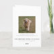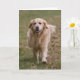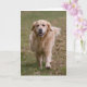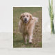 Una tarjeta de saludo con una imagen fotográfica a color de un feliz perro de Golden Retriever trotando por el pasto.