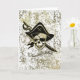 Pirata y espada impresas sobre un fondo blanco y dorado salpicado.