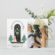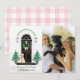 Con un Golden Retriever sonriente que lleva una bufanda rosa de punto. Un clásico porche delantero decorado para las fiestas, con árboles de Navidad con estrellas que flanquean la elegante puerta negra, una corona de pino con lazo de gingham rosa y faroles coronados con rosas y acebo. En el estilo de Magnolia | granja moderna | clásico elegante. 3 COLORES DE CUADROS PARA LA PARTE TRASERA ESTÁN EN EL DISEÑO (rosa como se muestra, verde oscuro o negro, simplemente edite y oculte los que no desee). ¡Agregue el retrato de su familia para un saludo personalizado de vacaciones!