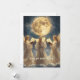 La imagen generada por IA representa una escena serena y mágica de un coro de tres ángeles cantando juntos bajo un cielo nocturno de color azul oscuro. Los ángeles, cada uno con halos suaves y túnicas blancas fluidas, están dispuestos armoniosamente, sus rostros expresando alegría y paz mientras cantan. Sobre ellos, una luna dorada grande y brillante proyecta una luz cálida, creando un efecto de halo alrededor de cada figura. Pequeñas estrellas espolvorean el fondo azul profundo, realzando el ambiente celestial. La ambientación general es pacífica y respetuosa, capturando la esencia de la temporada navideña.