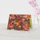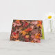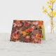 Tarjeta de saludo en blanco, con foto delante de las coloridas hojas caídas... amarillo pálido en el interior con otra pequeña foto de hojas de colores en la esquina inferior