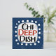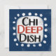 Un divertido y lindo diseño de mensajes tipográficos que dice "Chi Deep Dish". Tiene texto en negro y rojo sobre un rectángulo blanco con puntos blancos divertidos y juguetones rodeándolo, todo sobre un fondo azul.