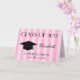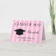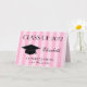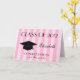 Esta divertida tarjeta de graduación de la universidad tiene un gorro de graduación en un fondo de banda rosa de dos tonos. Las palabras "Felicitaciones por tu graduación universitaria" aparecen debajo de la tapa y hasta puedes personalizar el diseño con el nombre del graduado. Una gran manera de felicitar a un graduado universitario. Derechos de autor Kathy Henis