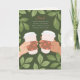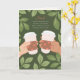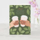 Esta tarjeta del Día del Padre es para los amantes del café. Con mi papá, siempre podía contarle sobre mi día o pedirle consejo mientras tomábamos una taza de café juntos. Nos juntábamos y no había problema que no se pudiera resolver. Esta ilustración presenta un borde botánico frondoso y dos manos sosteniendo tazas de café. El texto dice: "Papá, nada supera a una charla sincera y una buena taza de café contigo. La próxima corre por mi cuenta".