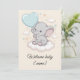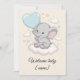 No hay una manera más dulce de decir 'Bienvenido bebé' que con esta adorable tarjeta de baby shower. Un pequeño elefante lindo se sienta en una nube esponjosa, sosteniendo un globo azul en forma de corazón, rodeado de estrellas pastel — la mezcla perfecta de suave y acogedor. Personalízala con el nombre del bebé para hacerla aún más especial. Ideal para un baby shower de niño, como recuerdo, o simplemente para agregar un poco más de amor a tu regalo.